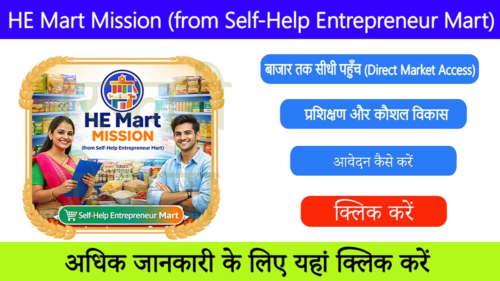 HE Mart Mission 2026тАУ27 (Self Help Entrepreneur Mart) рдорд╣рд┐рд▓рд╛рдУрдВ рдХреЗ рдЖрд░реНрдерд┐рдХ рд╕рд╢рдХреНрддрд┐рдХрд░рдг рдХреЗ рд▓рд┐рдП рд╢реБрд░реВ рдХреА рдЧрдИ рдПрдХ рдкрд╣рд▓ рд╣реИ, рдЬрд┐рд╕рдХрд╛ рдЙрджреНрджреЗрд╢реНрдп Self Help Group (SHG) рд╕реЗ рдЬреБрдбрд╝реА рдорд╣рд┐рд▓рд╛рдУрдВ рдХреЛ рд╕реНрдерд╛рдпреА рдмрд╛рдЬрд╛рд░ (Market Platform) рдЙрдкрд▓рдмреНрдз рдХрд░рд╛рдирд╛ рд╣реИред
