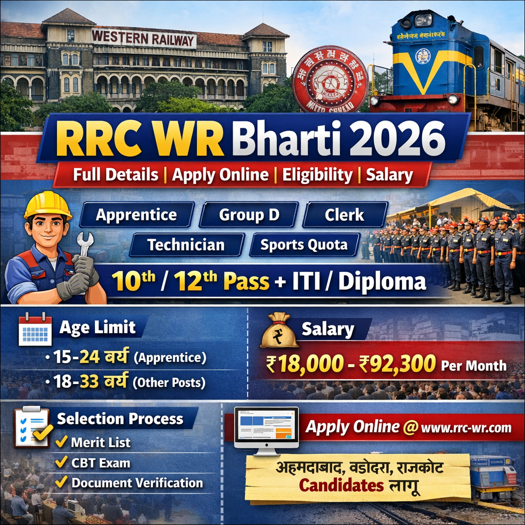 RRC WR (Western Railway) द्वारा हर वर्ष विभिन्न पदों के लिए भर्ती निकाली जाती है। यह भर्ती Apprentice / Group D / Sports Quota / Cultural Quota जैसे पदों पर होती है। 2026 में भी बड़ी संख्या में वैकेंसी आने की संभावना है।