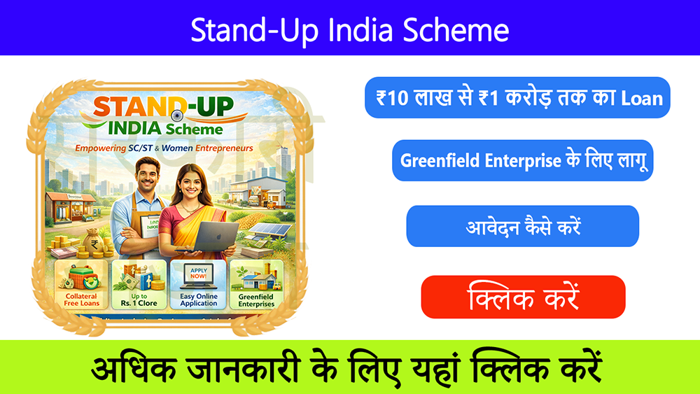 Stand Up India Scheme भारत सरकार की योजना है, जिसका उद्देश्य SC/ST और महिला उद्यमियों को नया व्यवसाय शुरू करने के लिए बैंक लोन उपलब्ध कराना है।